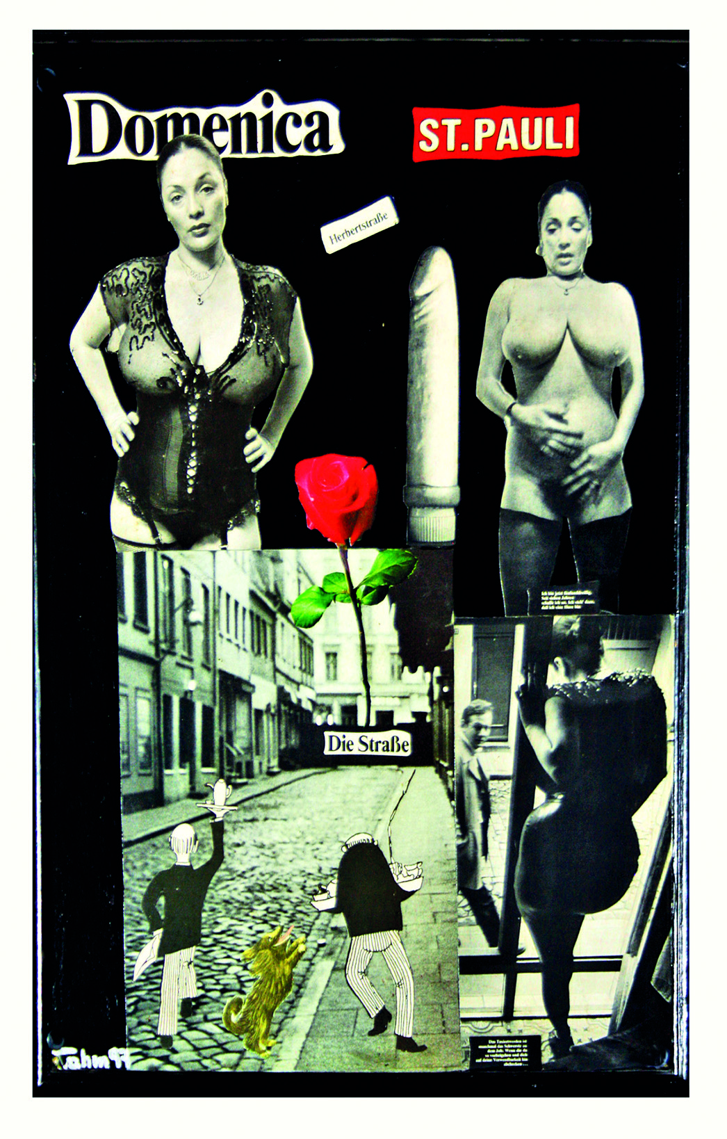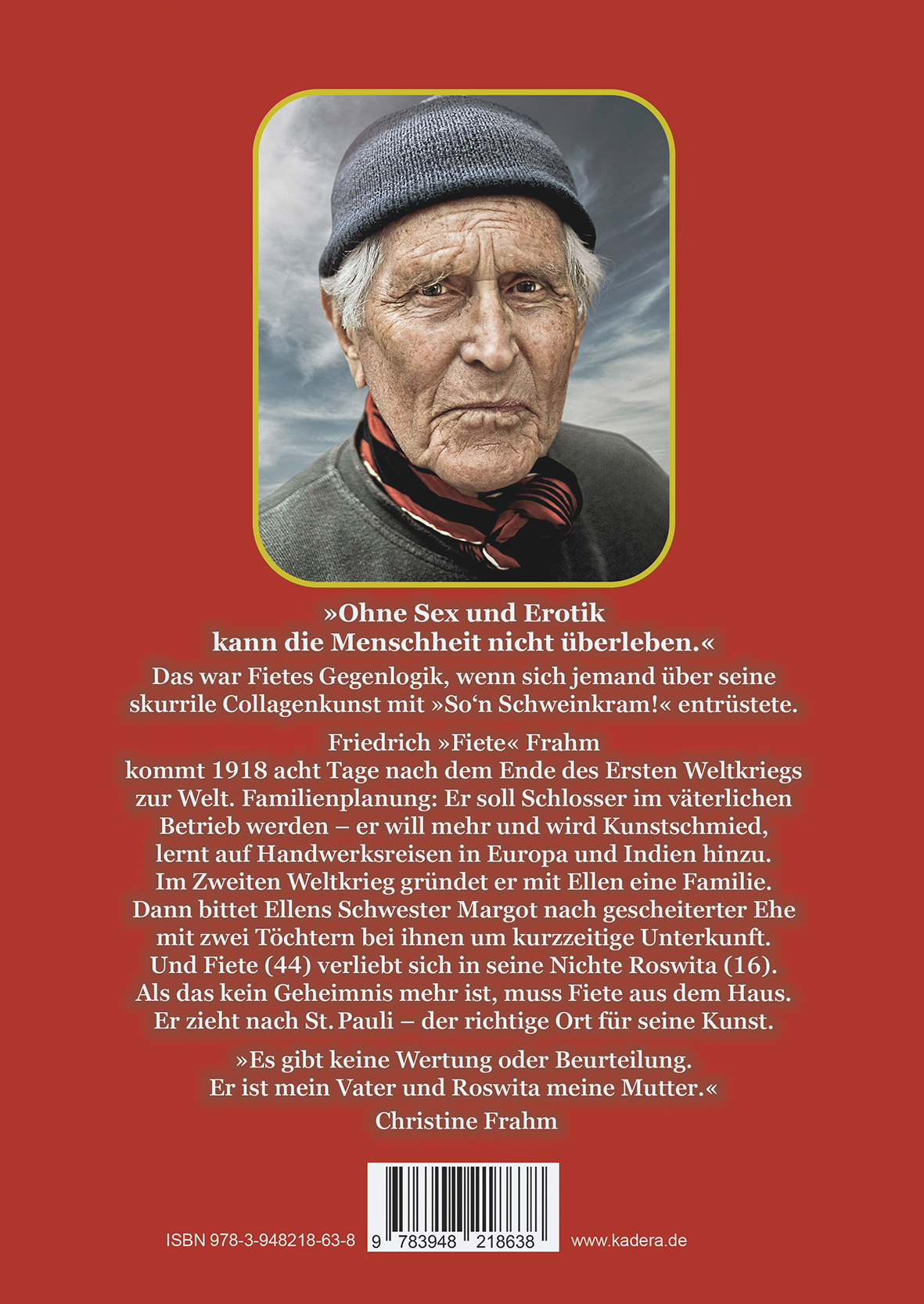 Friedrich »Fiete« Frahm kam kurz nach dem Ersten Weltkrieg zur Welt. Geplanter Nachkomme in der väterlichen Schlosserei – doch seine Gene wollten mehr. Er wird zunächst Kunstschmied und geht nach Handwerksbrauch »auf die Walz«, um in Europa und Indien hinzuzulernen. Aus dem Zweiten Weltkrieg kommt er verwundet zurück, gründet nach Genesung mit Ellen eine Familie. Sporen aus dem Bestand der nicht mehr existierenden berittenen Artillerie schmiedete er Kerzenständer. Dann bittet Ellens Schwester Margot nach gescheiterter Ehe mit zwei Töchtern bei ihnen um Unterkunft. Und Fiete (44) verliebt sich in seine Nichte Roswita (16). Als das kein Geheimnis mehr ist, muss Fiete aus dem Haus. Er zieht in Hamburgs Hafenviertel St. Pauli – der richtige Ort für seine Kunst. Und die richtige Kunst für diesen Ort. Als die hölzernen Türen im Bunker auf dem Heiligengeistfeld gegen Feuerschutztüren gewechselt wurden, beklebte er die alten Türblätter mit Dokumenten aus dem Leben Prominenter. Sein zweites Zuhause aber war das »Erotic Art Museum« in dem er Besuchern aus aller Welt seine Collagen erklärte.