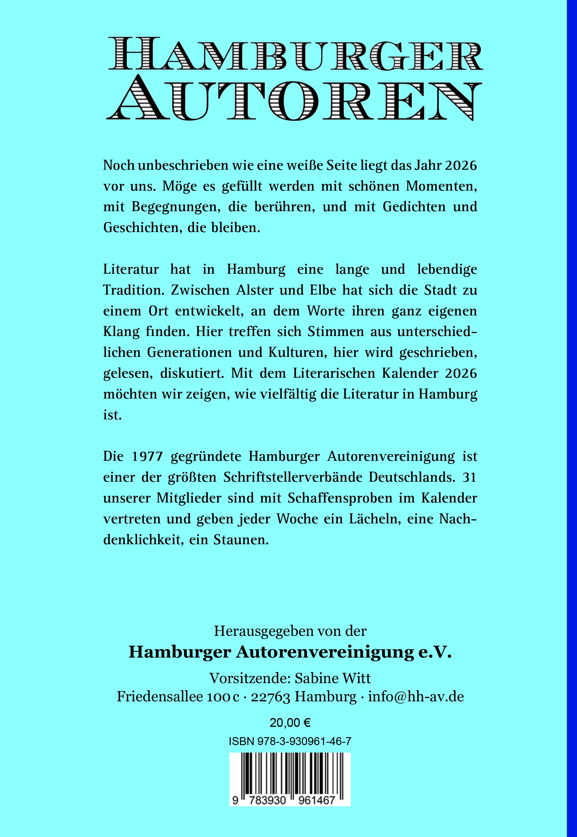 »Ich brauche Geschichten, um die Welt zu verstehen.« Siegfried Lenz sagte das. Auch er war Mitglied in der Hamburger Autorenvereinigung. Heute sind rund 160 schreibende Frauen und Männer darin vereint. 31 von ihnen füllten im Literarischen Kalender linken Seiten gegenüber den Wochentagen mit kurzen Geschichten, mit Gedichten mit und ohne Reim, mal zum Schmunzeln, mal zum Nachdenken, oft grafisch gestaltet. Sie sollen anregen, den freien Raum auf den Wochenseiten mit eigenen Einfällen und Erlebnissen zu füllen. So wird der Geschichten-Kalender zum Tagebuch (Termine haben viele lieber auf dem Smartphone). Zwei Jahre wurde der literarische Kalender in schlichter Form vereinsintern getestet. Jetzt soll der Nutzerkreis öffentlicher werden. Die Spiralbindung, die das schreibfreundliche flache Aufschlagen möglich macht, hat ein attraktives Hardcover bekommen, hat also Bücherbord-Tauglichkeit. So können Sie Jahr für Jahr Hamburgs vielfältige Literatur sammeln, schreibende Hamburger durch Kurzbiografie und Schaffensbeispiel kennenlernen – und gleichzeitig Erinnerungen aus dem eigenen Leben archivieren. Krimi-Fans wissen, wie hilfreich ein Tagebuch sein kann, wenn man ein Alibi braucht.
